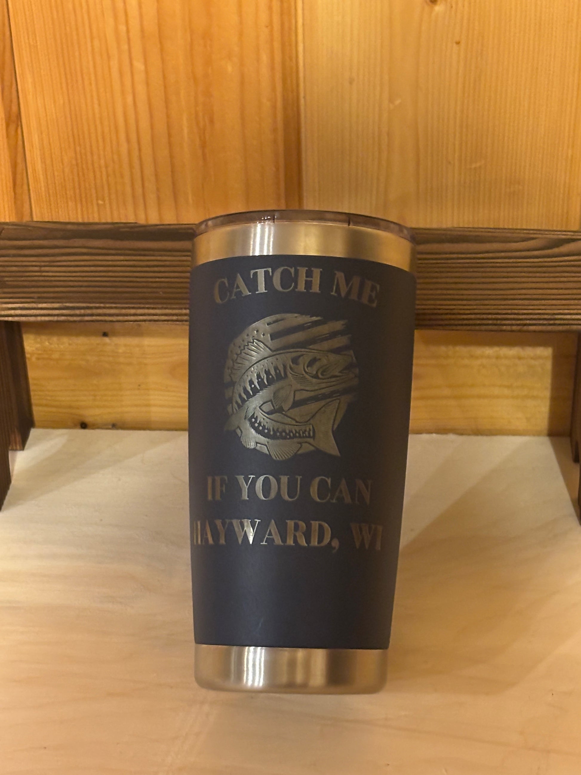 Show off your love for fishing and the Northwoods with this “Catch Me If You Can” insulated tumbler, proudly featuring Hayward, Wisconsin. Designed for anglers and outdoor enthusiasts, this sleek matte-black tumbler is laser-engraved with a bold fish graphic that won’t fade or peel.