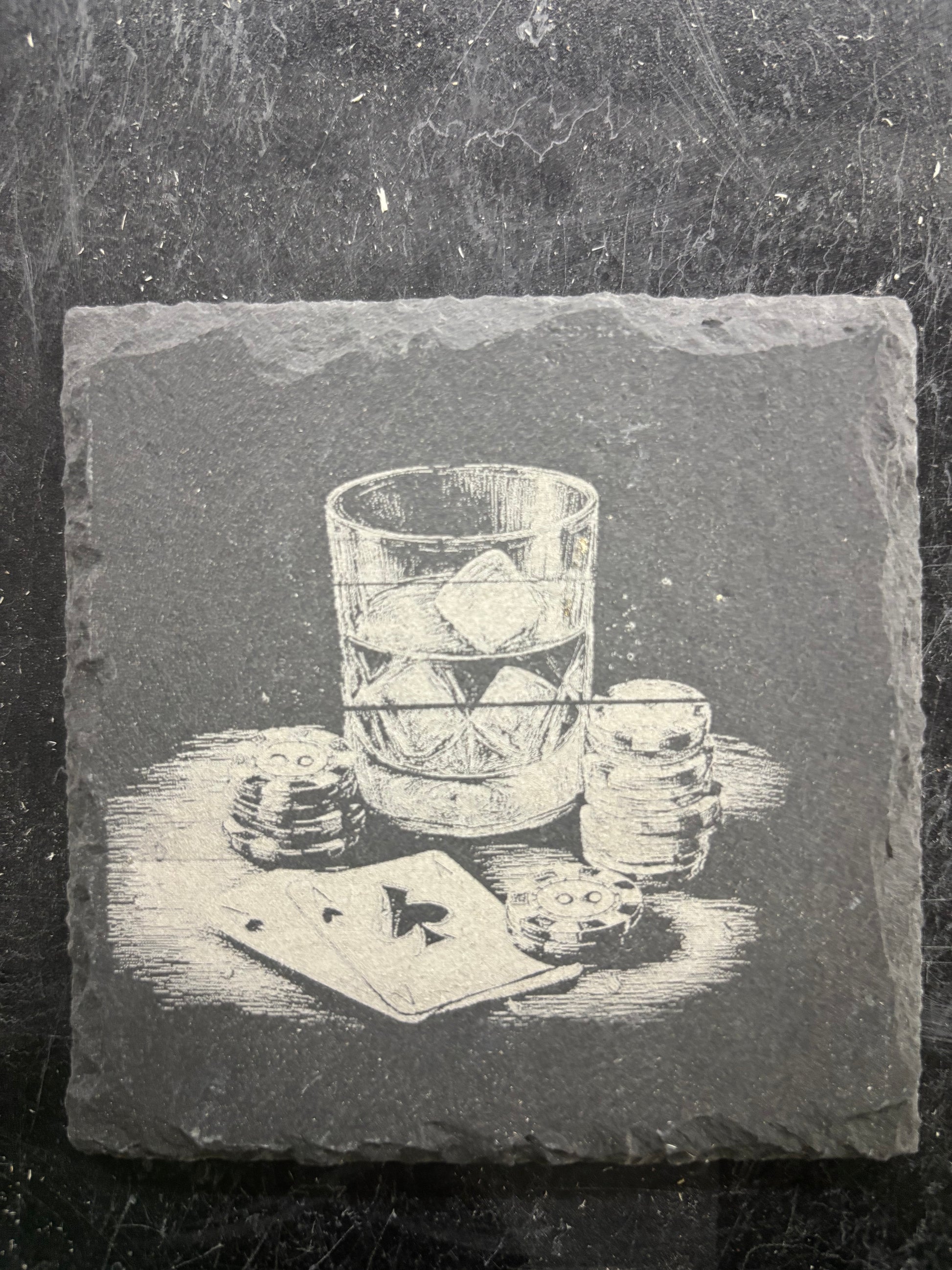 Engraved Slate Coaster – Whiskey Glass, Playing Cards & Poker Chips